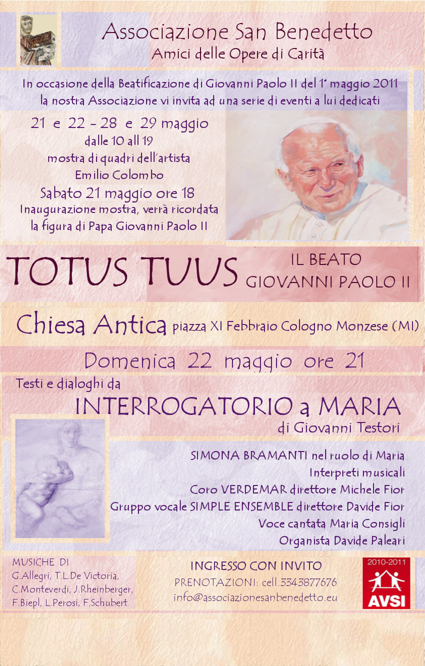 Maggio 2011 – Due eventi speciali organizzati in occasione della Beatificazione di Giovanni Paolo II. Concerto “Interrogatorio a Maria” e mostra “Totus Tuus – Il Beato Giovanni Paolo II – Quadri di Emilio Colombo”